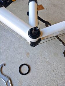 フレームの適当な場所とペダル根本あたりをロープで縛ってクランクが動かないようにすると作業が楽です。